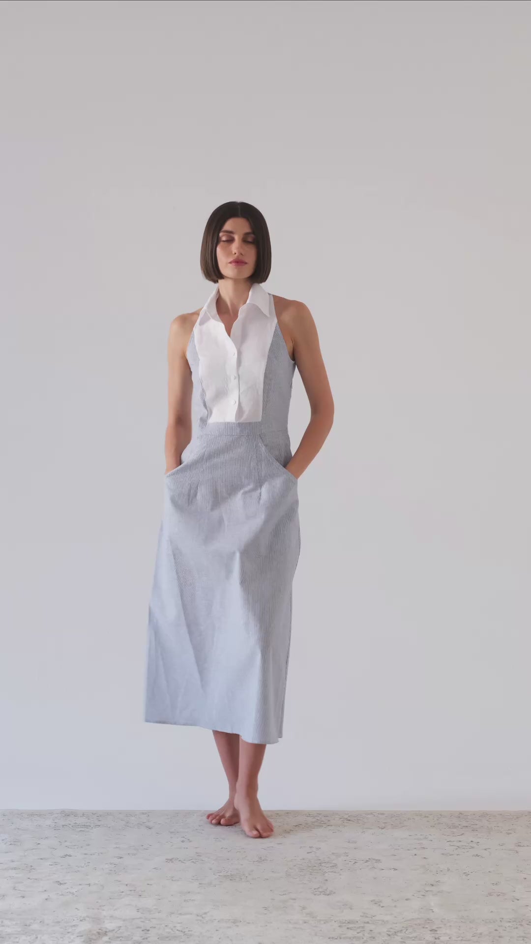 Meticulously tailored from 100% pure linen, this sleeveless dress presents a sophisticated reimagining of a smoking/tuxedo in a refined, feminine form. The crisp white front panel, detailed with a structured collar and mother of pearl button placket, contrasts elegantly with the fluid drape of our signature French Stripe linen. Cut to a graceful midi length, it evokes understated modernity and timeless poise - an effortless expression of contemporary elegance.